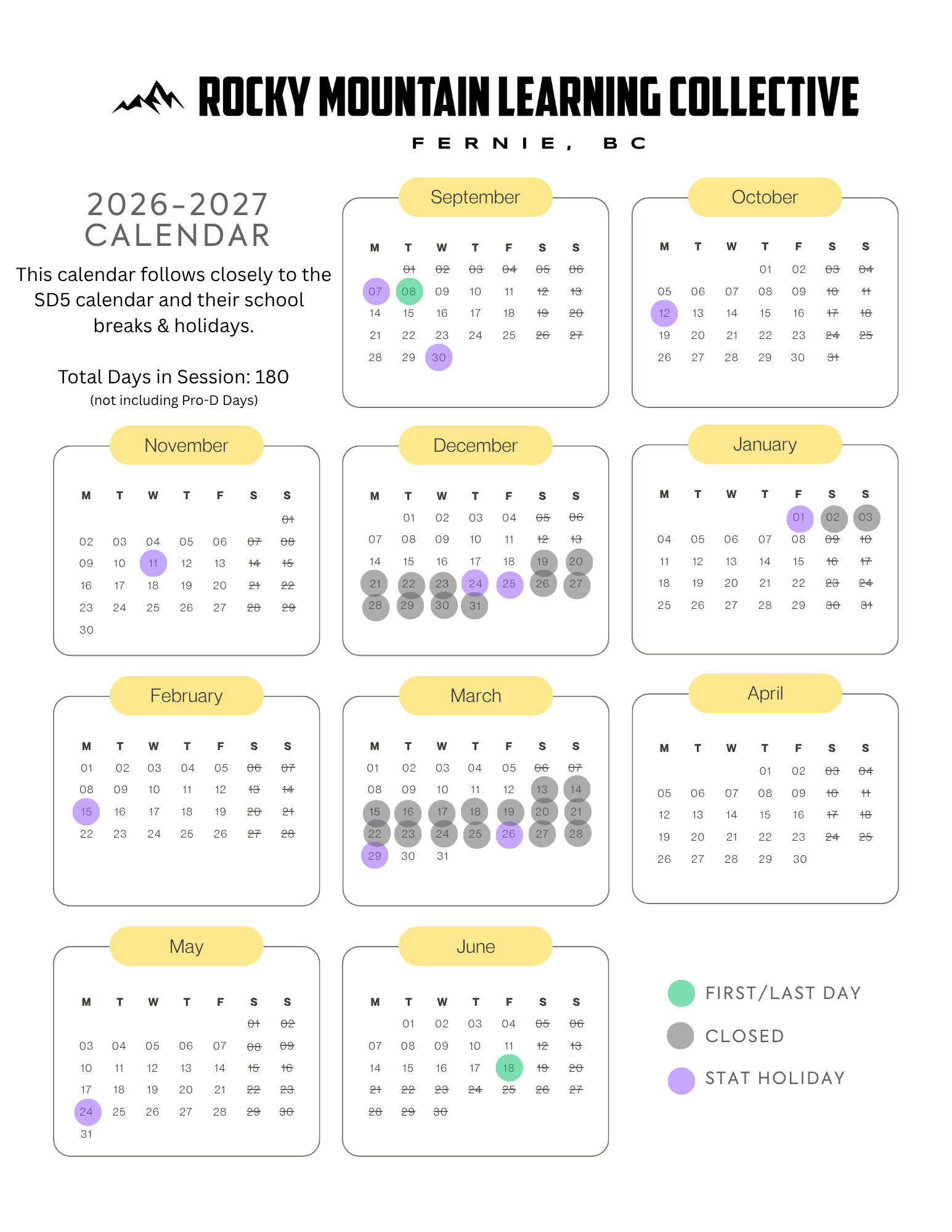 Rocky Mountain Learning Collective will follow closely to SD5's school calendar, including all stat holidays, winter, spring, and summer breaks. This may not include all Professional Development Days and No School Fridays.